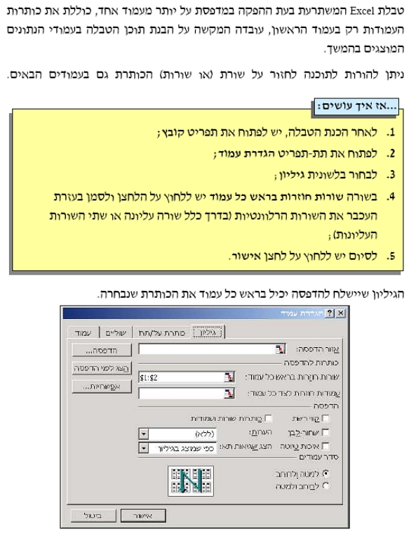 הדפסה - הדפסת חוזרת של הכותרת בכל עמודי הגיליון